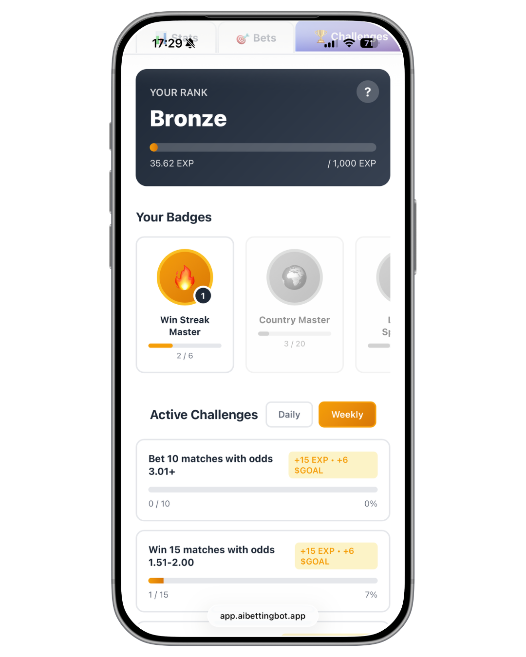 Place bets on matches, complete daily challenges, and progress through ranks to earn $GOAL tokens systematically.