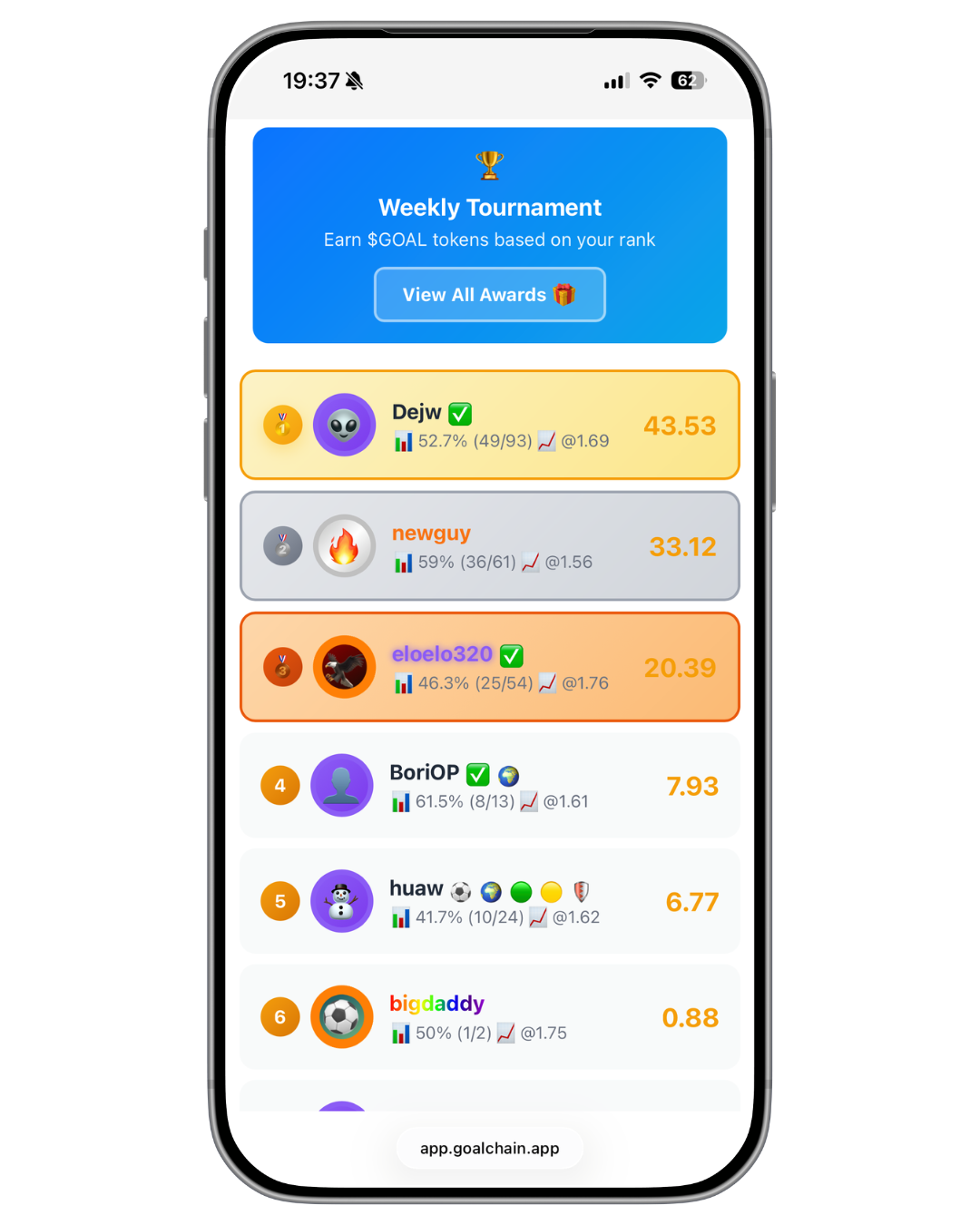 Place bets on matches, complete daily challenges, and progress through ranks to earn $GOAL tokens systematically.