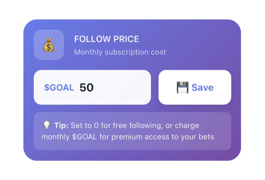 Set your own price for others to follow you – turn your tips into a steady stream of $GOAL income!