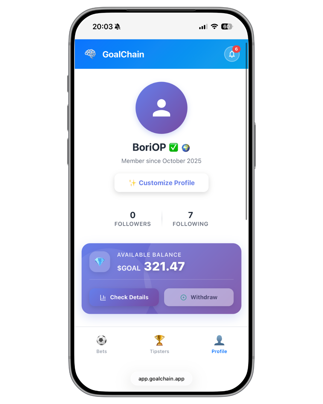 Withdraw $GOAL tokens directly or use them to customize your profile with exclusive features and upgrades.